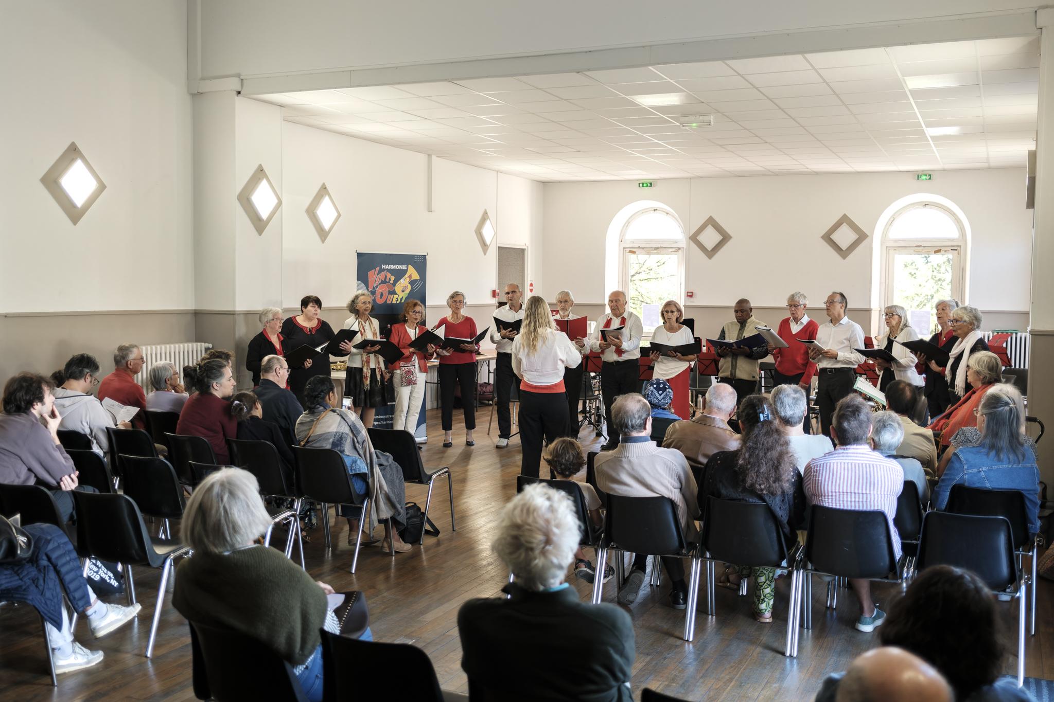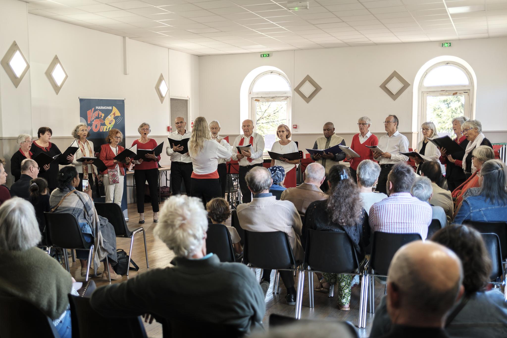 Dimanche 12 octobre 2025, la salle des fêtes de Mensignac a accueilli un public nombreux pour un après-midi musical exceptionnel, fruit de la rencontre entre deux formations amateurs de notre territoire : la chorale L’Oreille en Coin et l’Harmonie Vents d’Ouest.
